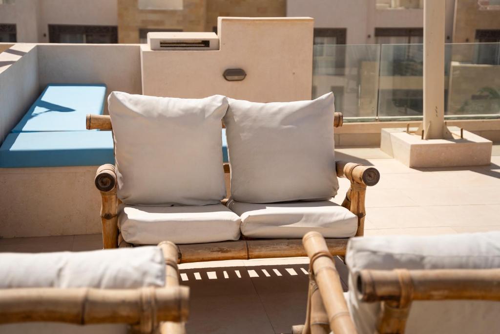 This modern private residence includes two bedrooms, two bathrooms, a spacious living room, dining area, and a fully equipped kitchen—providing a home-like experience rather than traditional hotel services. Every detail is designed for comfort, including air-conditioning, a private balcony, and access to a stunning rooftop terrace.